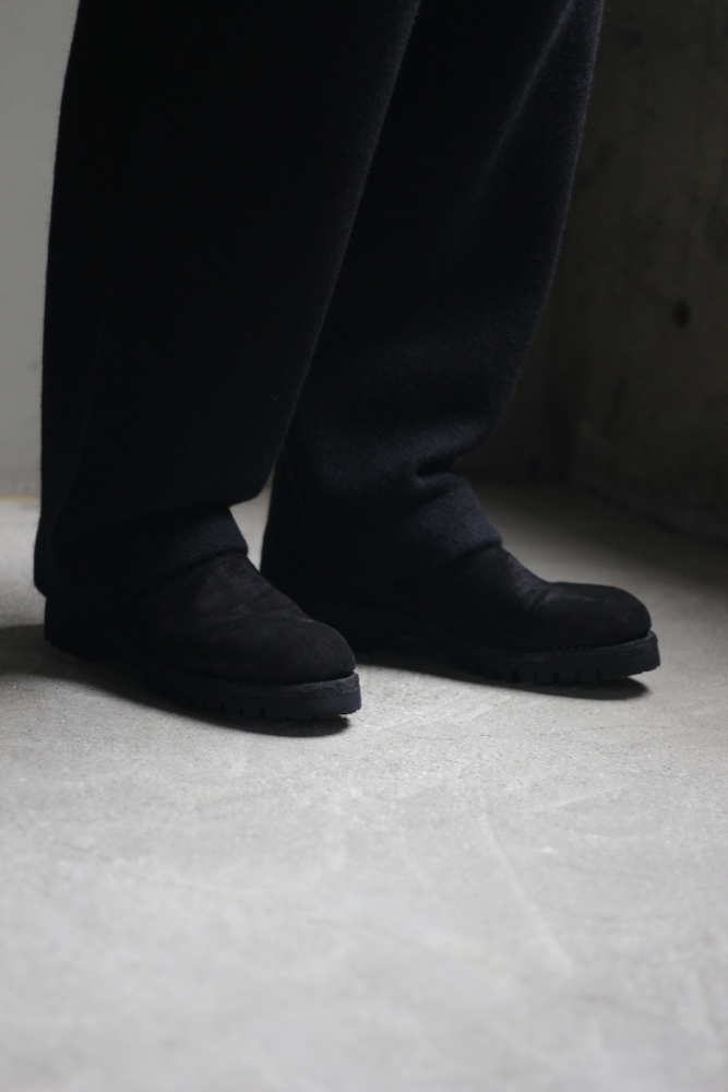 アッパーにはカーフスウェード、アウトソールにはvibram社のタンクソールを採用しており、革の鞣しから全ての工程を熟練工の手作業で製作しています。