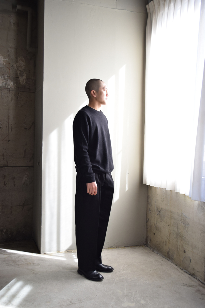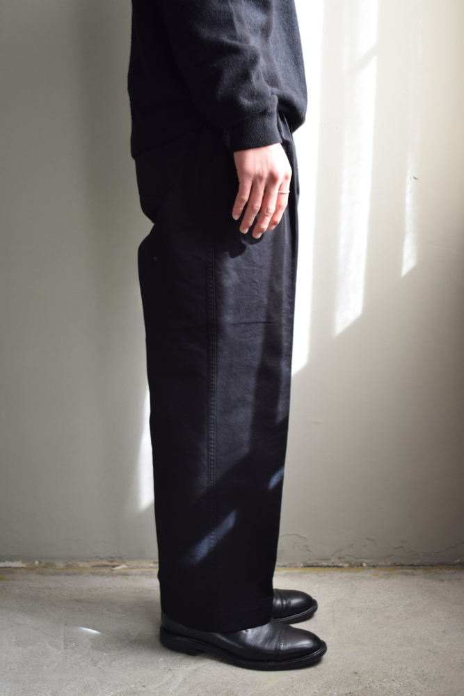 余裕のあるワイドフィットですが、ANOTHER OFFICE 特有の広がらずに落ちるシルエットを表現するため、何度もパターンの修正と生地テストを経て製作したアイテムです
