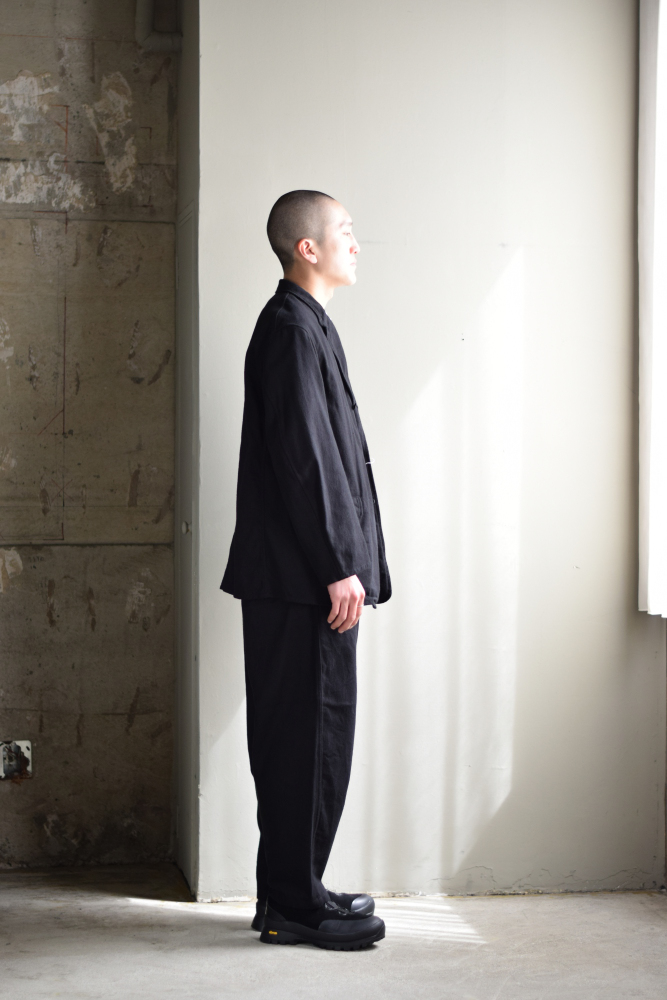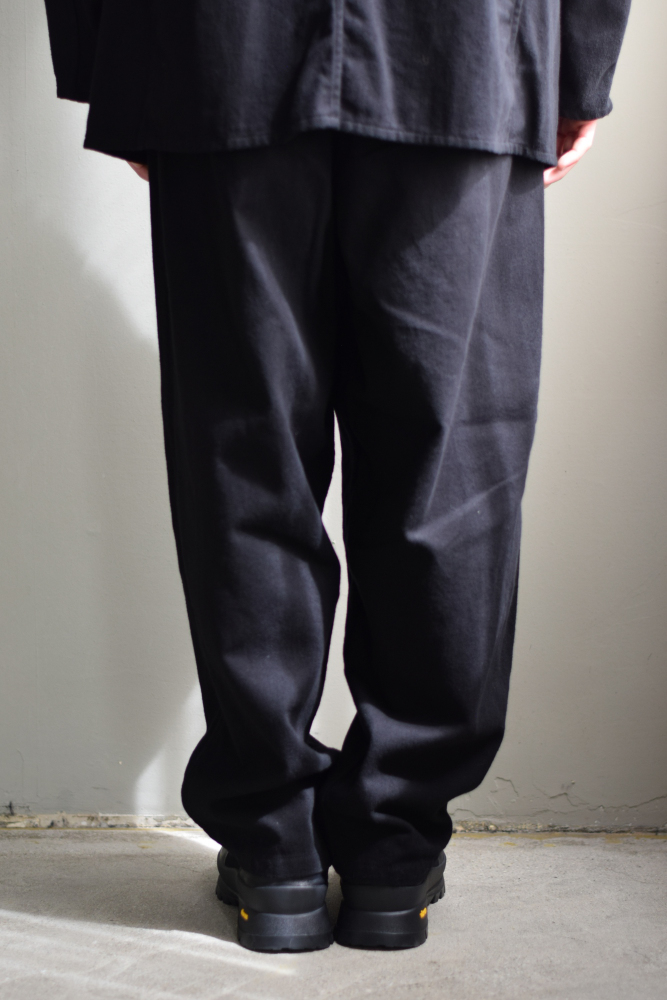 柔らかく、微起毛感のあるブラックドリル地で製作したテーパードパンツです。